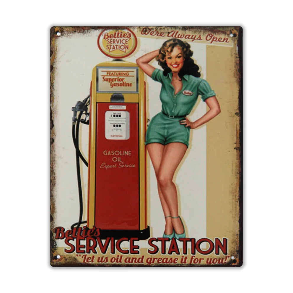 Tankstation met pin-up Bettie: “Let us oil and grease it for you” (laat ons het voor je oliën en smeren).