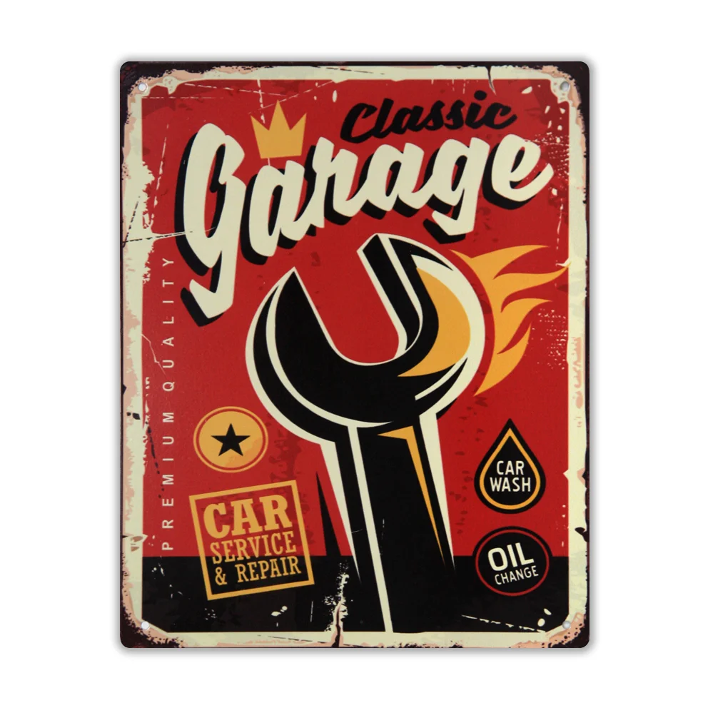 Vintage wandbord ‘Classic Garage’ met vlammende moersleutel.